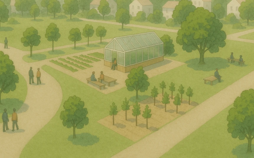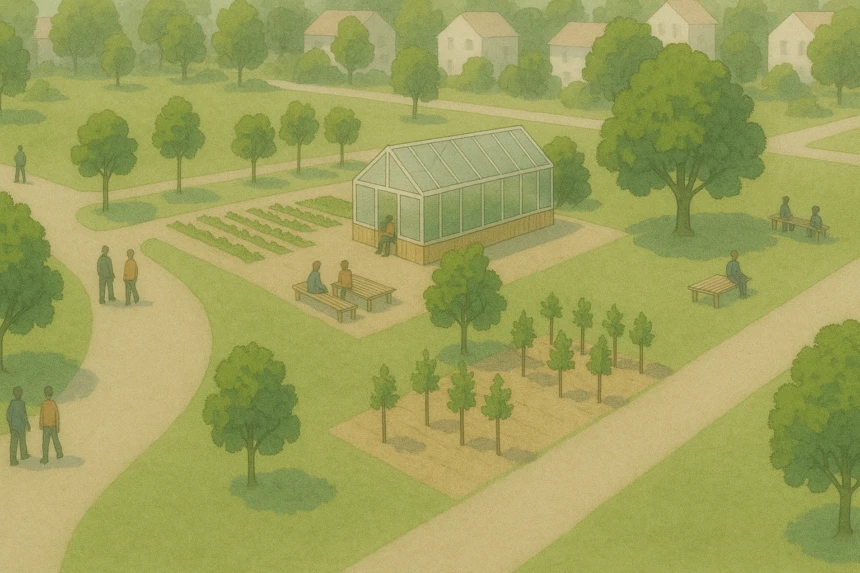 Am Kerngartenweg ist ein neuer Begegnungsort mit einer Klimabaumschule und einem Quartiergewächshaus entstanden.